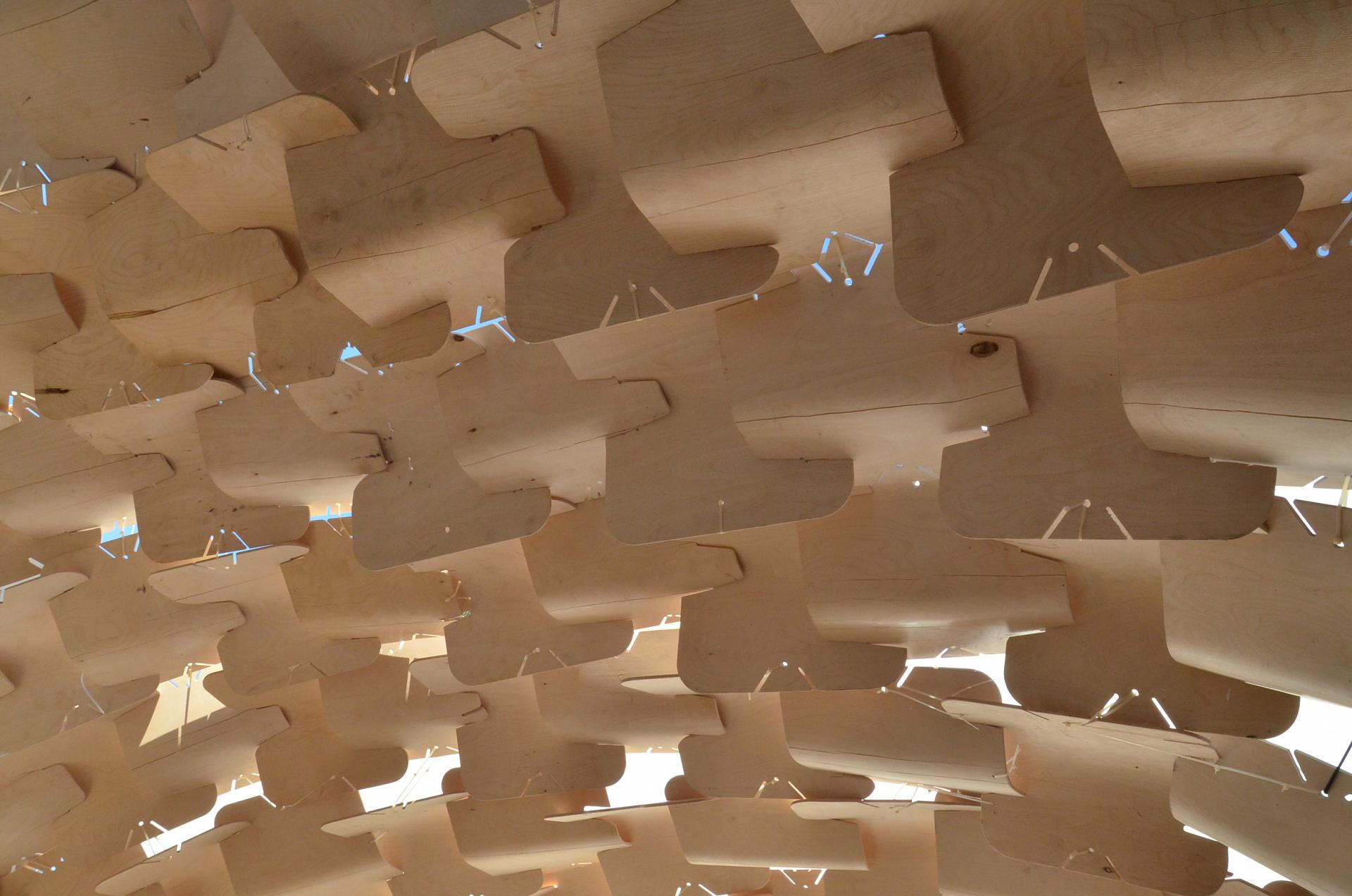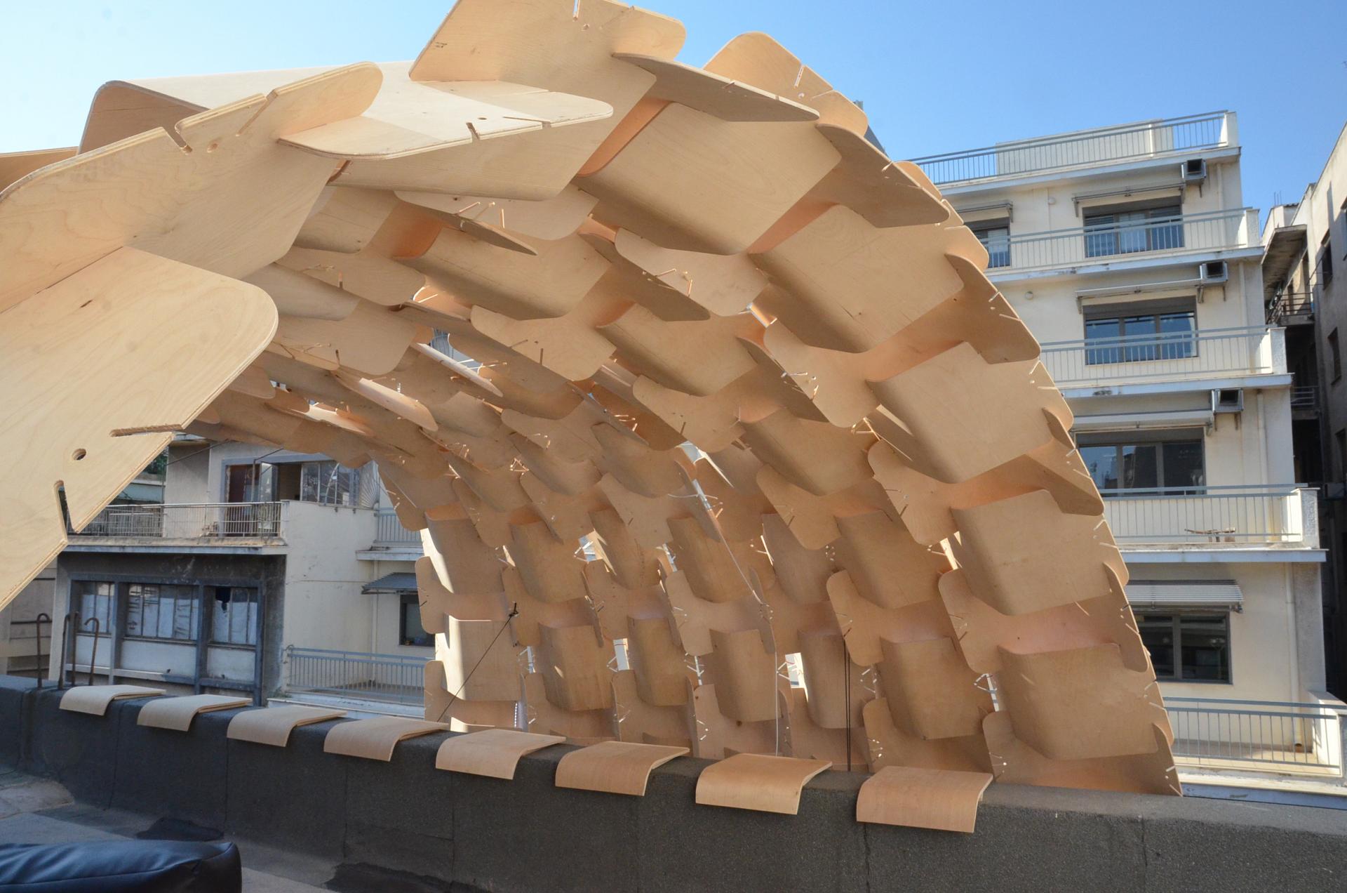 Σ’ αυτό το πλαίσιο, θα επιχειρήσουμε την απόδειξη της παραπάνω προσέγγισης με το σχεδιασμό και την πραγματοποίηση μιας πειραματικής, αυτοφερόμενης, τεκτονικής κατασκευής σε κλίμακα 1:1, από επεξεργασμένες ξύλινες επιφάνειες, για την αντιμετώπιση του ήλιου και της βροχής.